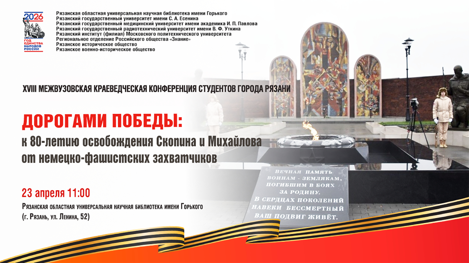 23 апреля 2026 года в Рязанской областной универсальной научной библиотеке имени Горького состоится XVIII межвузовская краеведческая конференция студентов города Рязани «Дорогами Победы: к 80-летию освобождения Скопина и Михайлова от немецко-фашистских захватчиков».