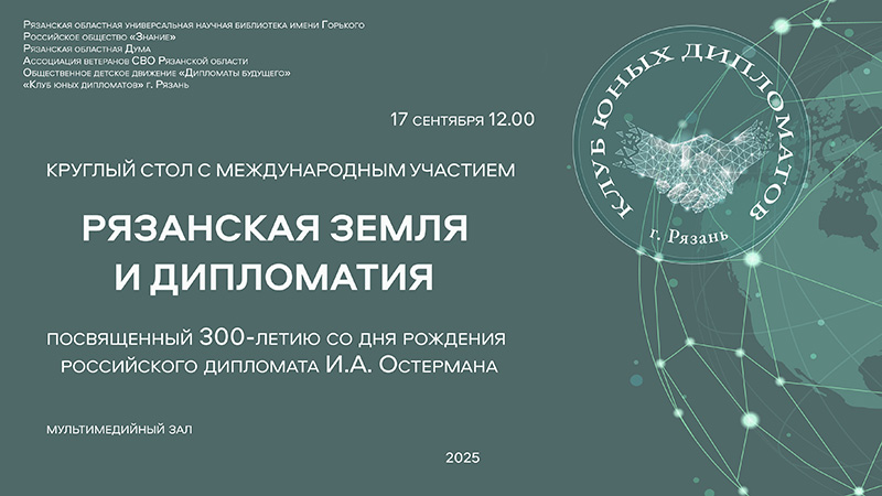Мультимедийный залРязанская областная универсальная научная библиотека имени Горького и Клуб юных дипломатов г. Рязани приглашают всех заинтересованных лиц принять участие в круглом столе с международным участием «Рязанская земля и дипломатия», посвященном 300-летию со дня рождения российского дипломата И.А. Остермана. Мероприятие пройдет при поддержке Российского общества «Знание», Рязанской областной Думы и Ассоциации ветеранов СВО Рязанской области.