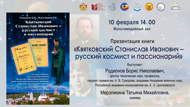 10 февраля в 14.00 в библиотеке имени Горького состоится презентация книги «Квятковский Станислав Иванович – русский космист и пассионарий».