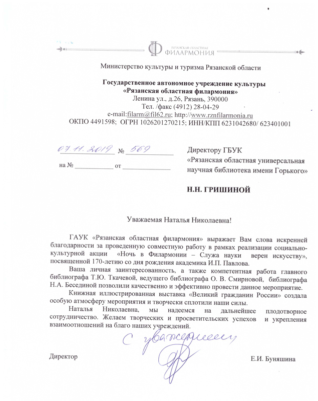 Наш вклад в проведение «Ночи в филармонии» был замечен и достойно оценен. Мы получили благодарственное письмо от директора Рязанской филармонии Елены Буняшиной, в котором она, в частности, пишет: «Книжная иллюстрированная выставка «Великий гражданин России» создала особую атмосферу мероприятия и творчески сплотила наши силы». С полным текстом письма вы можете ознакомиться на сканированном приложении.
