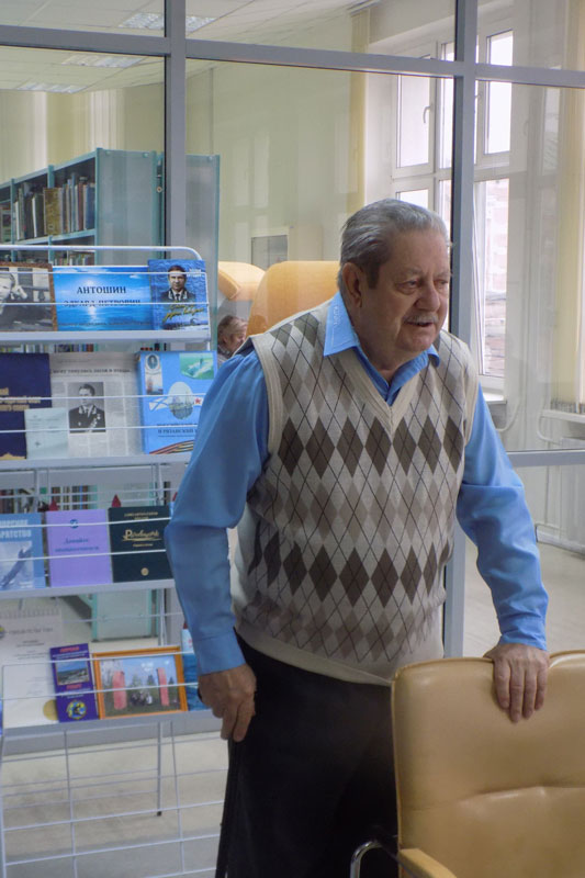 Выступления сопровождались показом видеоряда. В завершение презентации участники сфотографировались у книжной выставки, посвященной Э. П. Антошину.