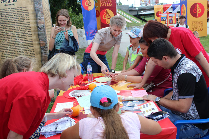 Сотрудники «Посольства Рязани» порадовались ответам участников викторины «Каждый житель, стар иль млад, край рязанский видеть рад», которые продемонстрировали глубокие знания о Рязанской области. Игра-бродилка «Памятники Рязани» позволила горожанам вспомнить скульптурные изображения знаменитых рязанцев, расположенные на улицах города. Свое собственное «Небо России» собрала рязанская детвора. Объемная аппликация, украшенная точечной росписью, удалась на славу, а заодно самые юные жители города узнали, какой легендарный рязанский герой первым поднялся в небо на воздушном шаре. В награду за правильные ответы участники получили закладки с именами выдающихся рязанцев и открытки с видами нашего кремля.