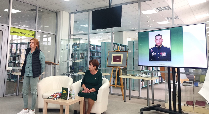 Елена Алексеевна говорила об истории написания книги, о ее главных героях. Первый очерк посвящен Герою России, выпускнику Рязанского гвардейского высшего воздушно-десантного командного училища имени генерала В.Ф. Маргелова Алексею Курганову. На встрече присутствовала вдова Алексея Курганова Мария. Она рассказала о том, как они познакомились с Алексеем, каким он был отзывчивым человеком, о том, что она воспитывает двух сыновей, достойными памяти отца.