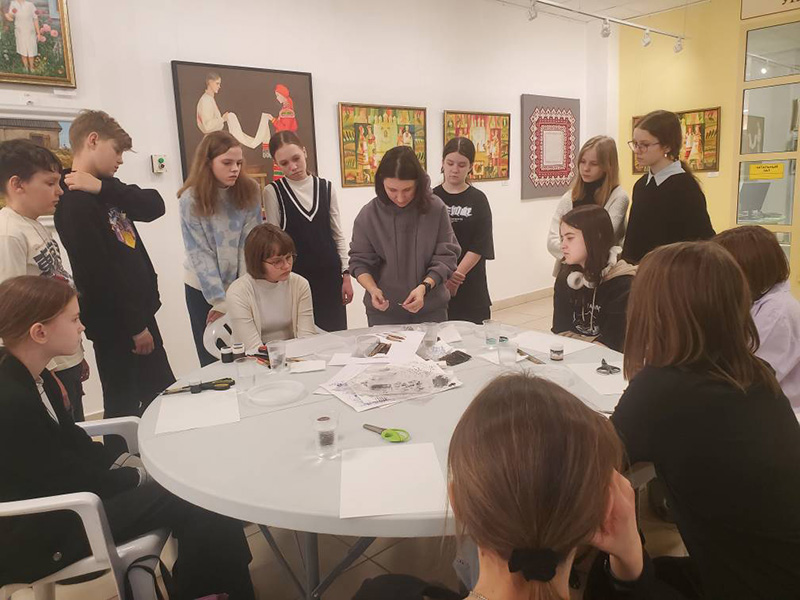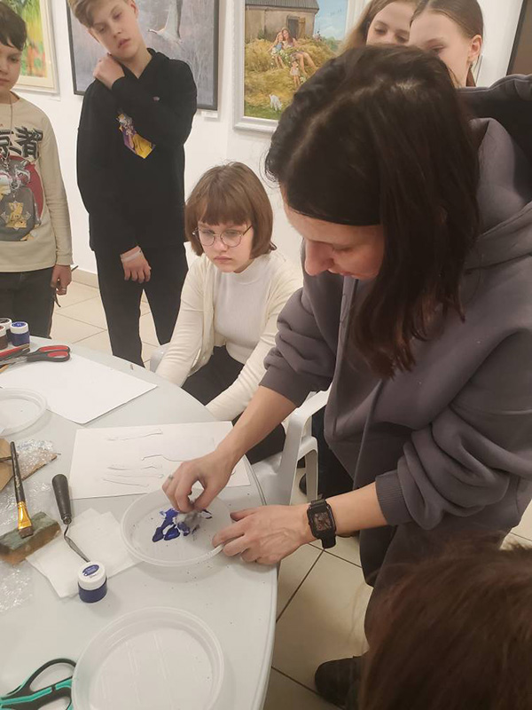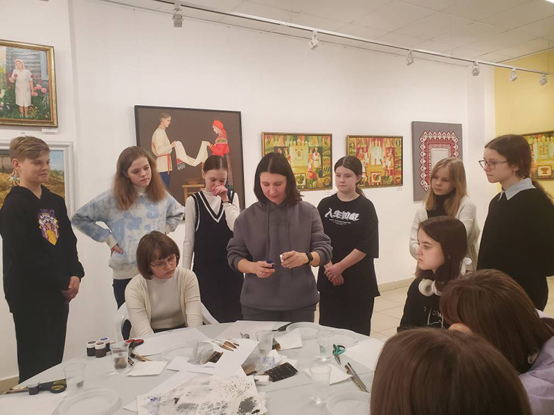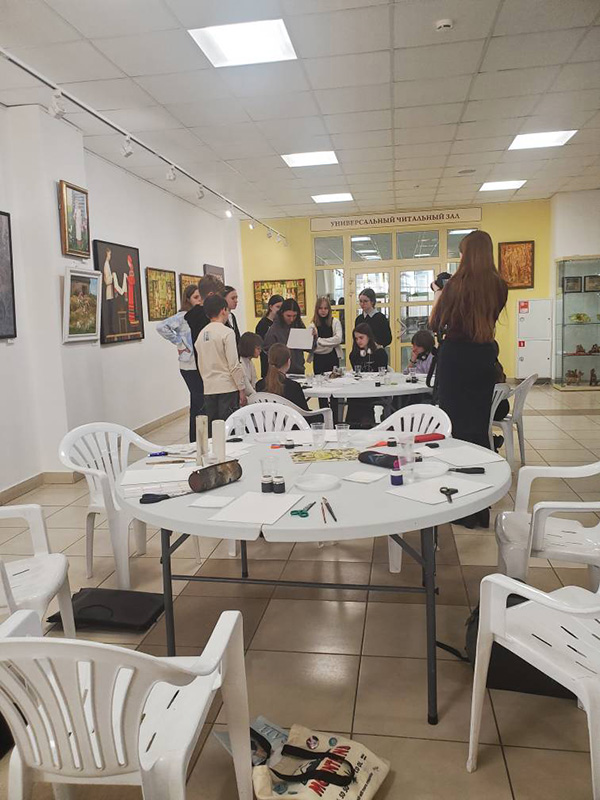 13 марта в Рязанской областной библиотеке имени Горького в рамках работы выставки «Семейный круг» и фестиваля «Рязанские мадонны» художник-график, член Рязанской областной организации Союза художников РФ Екатерина Вячеславовна Трубникова провела мастер-класс «Графика. Натюрморт. Печать фактурами» для учеников детской художественной школы № 1.