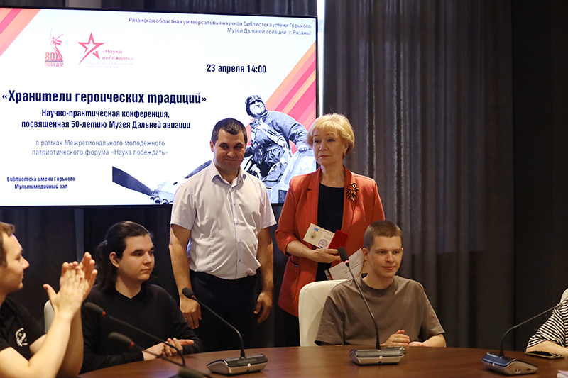 Заместитель директора по молодежной политике и развитию Рязанского института (филиала) Московского политехнического университета Алексей Вадимович Агузаров сообщил о патриотическом воспитании студентов и вручил медали имени А.В. Белякова за большой вклад в патриотическое воспитание директору Музея Дальней авиации Владимиру Васильевичу Самошину, заместителю начальника Музея Сергею Михайловичу Пинаеву и директору библиотеки Наталье Николаевне Гришиной.