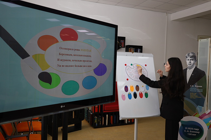 На площадках библиотеки для учащихся школ № 47 и 11 были организованы тематические станции, на которых ребята погрузились в поэтическую стихию Сергея Есенина. Школьники успешно ответили на вопросы, «прогуливаясь по Есенинскому бульвару», одержали победу в «Литературной дуэли» Есенина и Маяковского, на станции «Я растил себя поэтом…» раскрыли тайну «черного ящика» и узнали имя «злейшего друга» поэта. Затем по ассоциациям, цветам и звукам участники игры вспоминали хорошо известные стихотворения Сергея Есенина. А на станции «Всю душу выплещу в слова» разобрали историзмы, архаризмы и диалекты, используемые Есениным в своей поэзии.