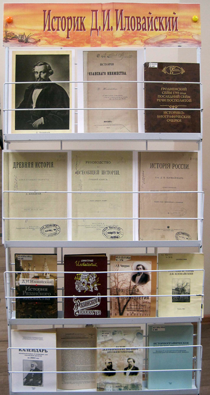 Сотрудники краеведческого отдела библиотеки подготовили книжную выставку «Историк Д.И. Иловайский». В экспозиции была представлена только малая часть книг известного историка, хранящаяся в фондах РОУНБ. В библиотеке находится первое прижизненное издание монографии 1858 г. «История Рязанского княжества» с автографом Д.И. Иловайского. Учебники, написанным Дмитрием Ивановичем, по которым дети в России до революции 1917 г. изучали отечественную историю, до сих пор не потеряли своей актуальности. Монографии историка выдержали десятки переизданий. В 2014 году была издана отдельной книгой публицистика Д.И. Иловайского, сборник так и называется – «Публицистика». Как отметил в своем выступлении Л.В. Чекурин, эта область деятельности ученого еще недостаточно изучена. Книги крупнейшего исследователя жизни и творчества Д.И. Иловайского, кандидата исторических наук, профессора Леонида Васильевича Чекурина также были размещены на выставке.