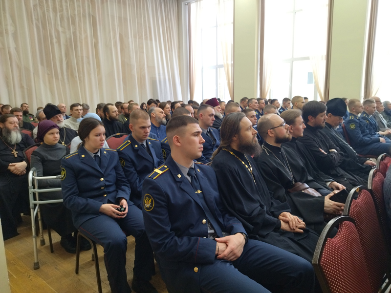 В зале собрались духовенство, православные миряне, курсанты Рязанского гвардейского высшего воздушно-десантного ордена Суворова дважды Краснознаменного командного училища имени генерала армии В.Ф. Маргелова и Академии ФСИН России.