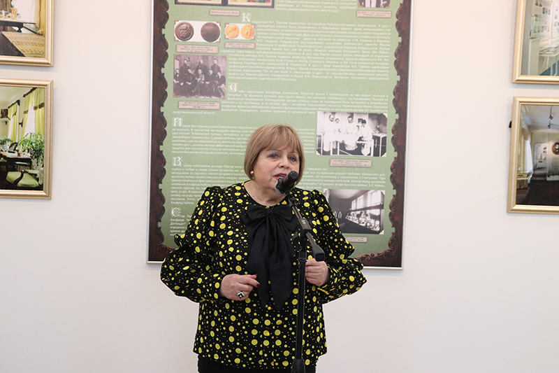 Главный хранитель Мемориального музея-квартиры академика И.П. Павлова в г. Санкт-Петербурге, старший научный сотрудник Института физиологии имени И.П. Павлова РАН Юлия Андреевна Кораблина выступила с приветствием онлайн. Она поблагодарила организаторов выставки и пожелала всем, кто чтит память об И.П. Павлове, «продолжать работу по увековечению имени славного сына русской земли и великого подвижника науки».