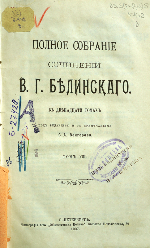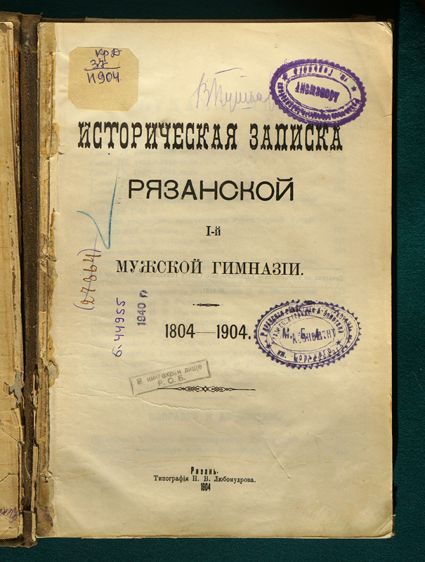 Первые десятилетия XX века стали для России эпохой бурных потрясений. Вслед за сменой политической власти в октябре 1917 г. в стране началась Гражданская война, которая привела к экономическому кризису и хозяйственной разрухе. Среди тех, кто в это трудное время руководил работой Рязанской губернской центральной библиотеки (предшественницы РОУНБ имени Горького) был Владимир Степанович Пушкарев, назначенный на должность заведующего в июне 1922 г. Возможно, тогда и появились в ее фонде издания конца XIX – начала XX веков с владельческими штампами «Изъ библiотеки Пушкарева», «Изъ библiотеки В. Пушкарева», «Изъ книг В.С. Пушкарева». Это IV, VI, VIII и IX тома из полного собрания сочинений В.Г. Белинского (СПб., 1900–1948), лекции М. Ковалевского «Очерк происхождения и развития семьи и собственности», изданные Ф. Павленковым в серии «Популярно-научная библиотека» (СПб., 1896), труд И. Энгельмана «История крепостного права в России» (М., 1900), пособие к лекциям В. Герье «Основы римской истории» (М., 1899) и конволют, составленный из двух книг: «Записки» И.Д. Якушкина (СПб., 1905) и издание М.В. Пирожкова «Из писем и показаний декабристов: критика современного состояния России и планы будущего устройства» (СПб., 1906). Экземпляр юбилейного издания «Исторической записки Рязанской I-й мужской гимназии» (Рязань, 1904) с владельческой подписью В.С. Пушкарева на титульном листе занял достойное место в коллекции автографов РОУНБ имени Горького.