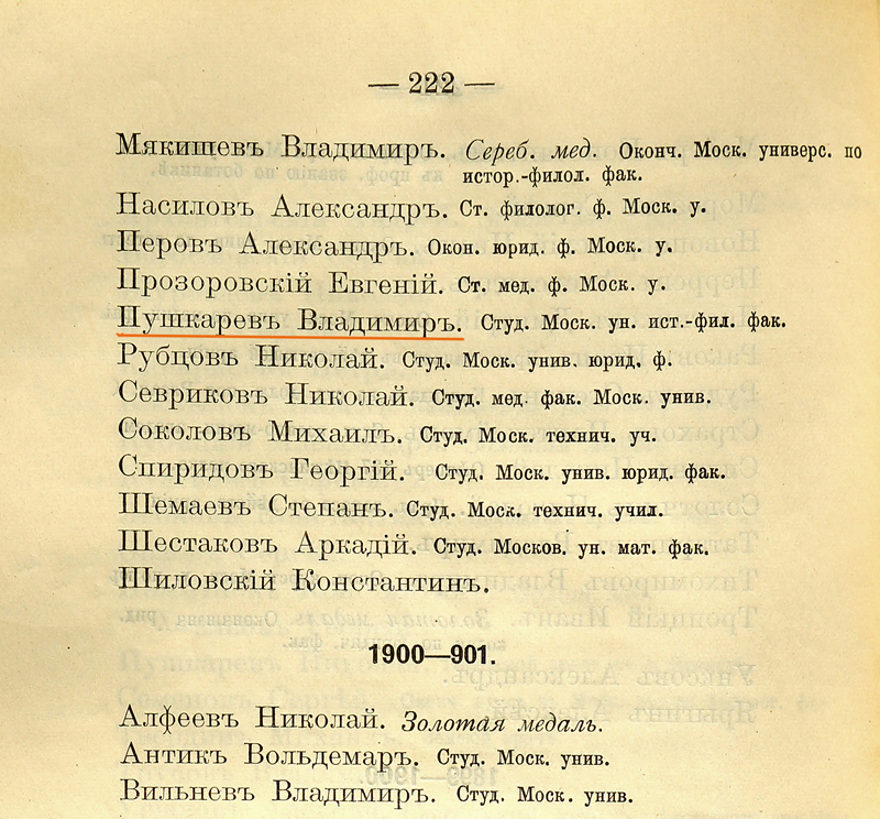 16 августа 1889 г. десятилетний Владимир Пушкарев поступил в 1-й класс Рязанской I-й мужской гимназии, а в 1900 г., получив аттестат зрелости, стал студентом историко-филологического факультета Московского университета. В 1907 г., окончив его, ходатайствовал о предоставлении места учителя в среднем учебном заведении Харьковского учебного округа. Однако попечитель округа в этой должности его не утвердил, так как на свой запрос в канцелярию рязанского губернатора получил неблагоприятные сведения о политической благонадежности В.С. Пушкарева. В отзыве было сказано, что в 1901 г. за участие в студенческих беспорядках Владимир Степанович был выслан из Москвы в Рязань и отдан на поруки матери. За время проживания в Рязанской губернии, говорилось далее, был замечен в сношениях с людьми, политически неблагонадежными, а в марте 1906 г. при обыске в его квартире (Введенская пл., дом Чистосердовых) нашли нелегальную литературу. Согласно другим документам из дела о политической благонадежности В.С. Пушкарева ничего предосудительного при обыске найдено не было.