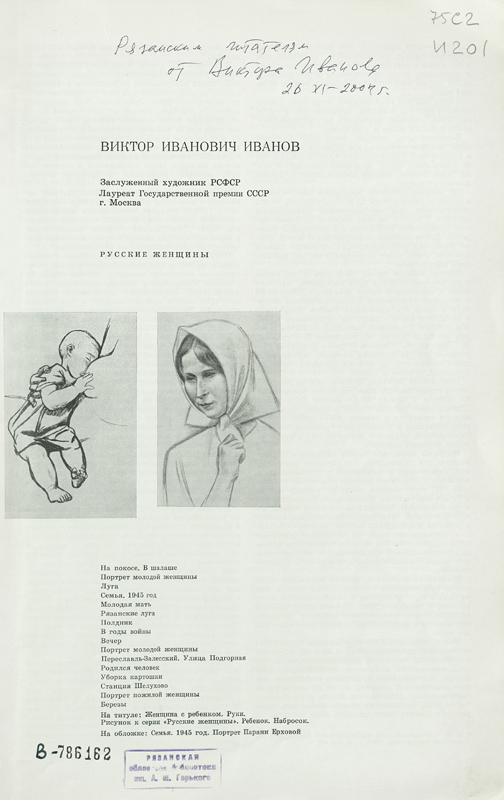 В фонде библиотеки имени Горького в «Коллекции автографов» хранятся книги с автографом Виктора Ивановича. На титульном листе сборника «Русские женщины» имеется следующая надпись: «Рязанским читателям от Виктора Иванова». На титульном листе книги «Виктор Иванов» Виктор Иванович написал: «Елене Геннадиевне Царевой на память о посещении галереи от Виктора Иванова». Царева Елена Геннадиевна в 2008 году возглавляла Комитет по культуре и туризму Рязанской области. Эту книгу она подарила нашей библиотеке.