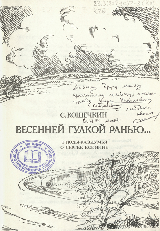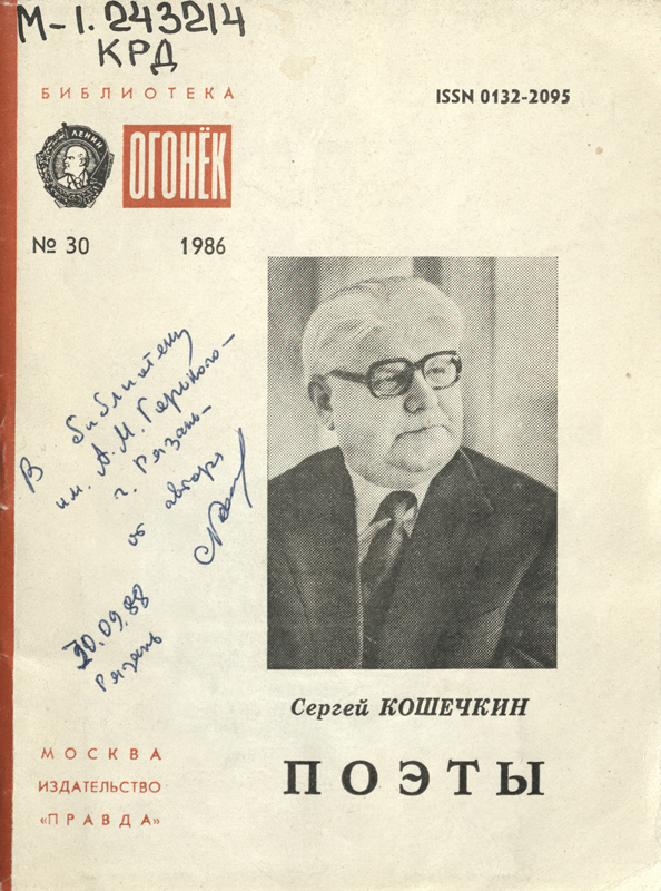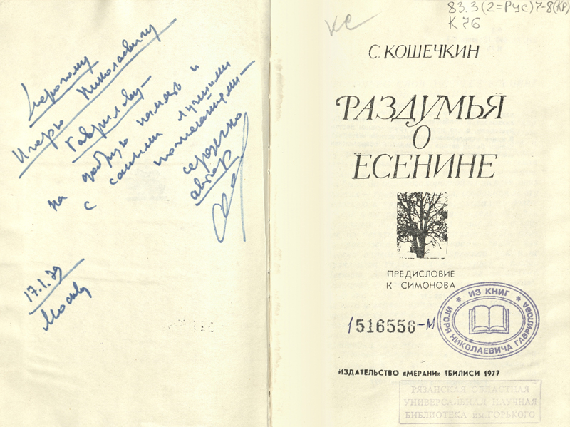 В библиотеке им. Горького в «Коллекции автографов» хранятся книги с автографами Кошечкина: книга «Поэты», предназначенная именно библиотеке, а также три книги с дарственными надписями, адресованными рязанскому литературоведу Игорю Николаевичу Гаврилову. Теплые, дружеские пожелания Сергея Петровича Кошечкина Игорю Николаевичу можно прочитать на сканированных изображениях.