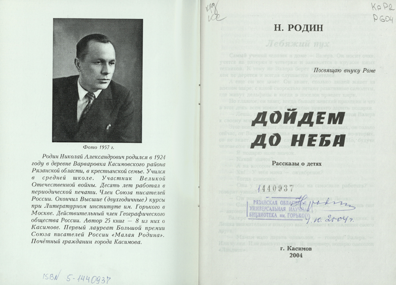 В фонде библиотеки им. Горького в «Коллекции автографов» хранятся три книги Николая Родина с автографами автора. Увидеть дарственные надписи можно на сканированных изображениях. Также в фонде нашей библиотеки хранятся письма Н.А. Родина. Познакомиться с ними можно в читальном зале нашей библиотеки.