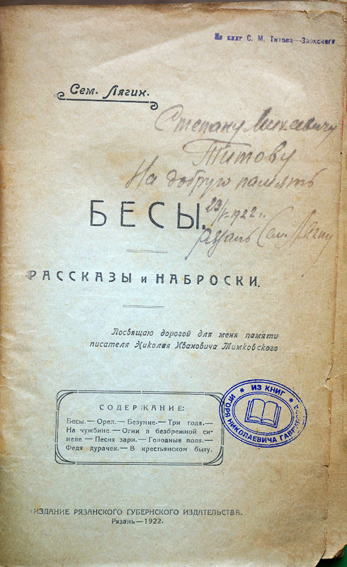 В апреле 1922 года тиражом 1000 экземпляров вышел в свет его единственный сборник рассказов «Бесы». Он посвятил его памяти писателя Н.И. Тимковского, с которым был хорошо знаком и с которым переписывался в течение пяти лет. 23 мая 1922 года С.И. Лягин подарил экземпляр своей книги другу и односельчанину, поэту, журналисту и будущему краеведу С.М. Титову-Заокскому (1893 – 1971), надписав на титульном листе: «Степану Михеевичу Титову на добрую память». Спустя много лет это издание, в числе других, было передано его владельцем известному деятелю культуры Рязанского края, ученому и литературоведу Игорю Николаевичу Гаврилову (1926 – 2003), для которого Степан Михеевич предоставил краткие биографические и библиографические сведения о Лягине. В настоящее время сборник рассказов с инскриптом автора оцифрован и хранится в краеведческом депозитарии библиотеки им. Горького.