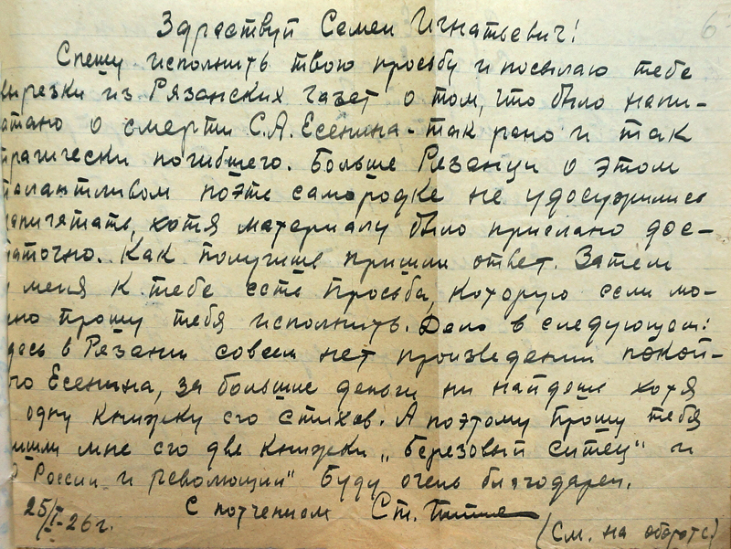 Информация о Семене Игнатьевиче Лягине, выходце из семьи государственных крестьян, в печатных источниках и интернет-ресурсах однотипна и порой недостоверна. Обращение к фондам ГАРО, РГАЛИ, ИРЛИ и ИМЛИ, в которых сохранилась его переписка с редакциями, литературными объединениями и писателями, позволило восполнить пробел в биографических и библиографических сведениях о нашем земляке.