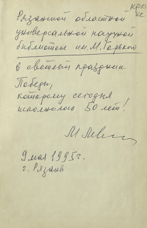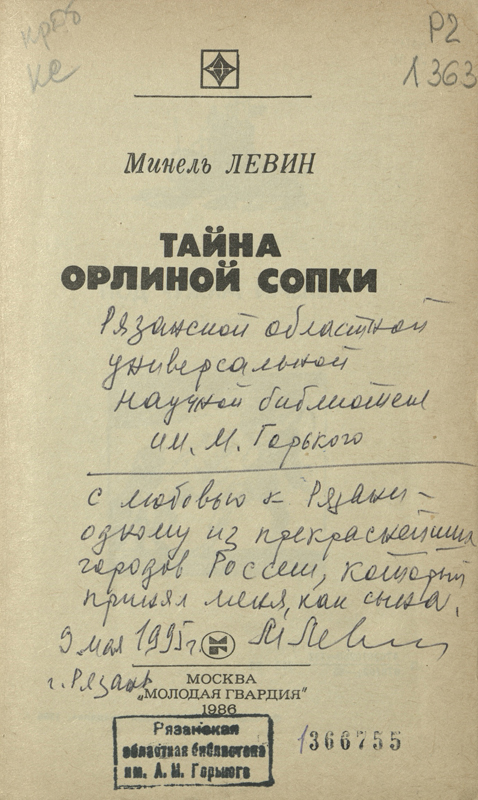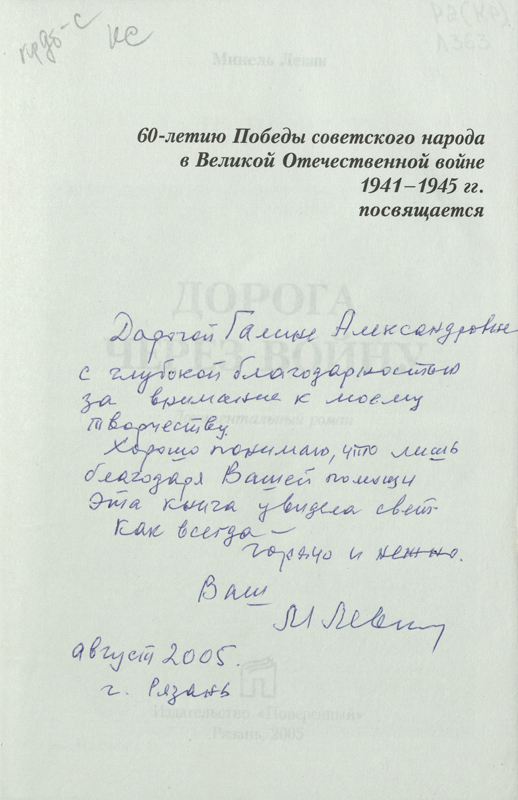 В фонд Рязанской библиотеки им. Горького Минель Иосифович Левин передал в дар несколько книг с автографами советских писателей. В «Коллекции автографов» хранятся также четыре книги самого Минеля Левина с автографами автора. Увидеть их можно на файл-изображениях.