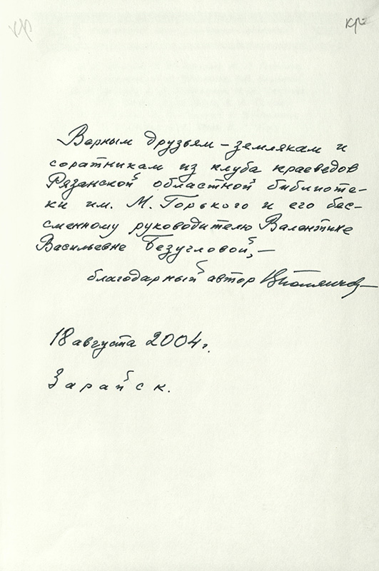 В «Коллекции автографов» нашей библиотеки есть несколько книг с автографами автора, посвященные рязанскому клубу краеведов, читателям Рязанской областной библиотеки, сотрудникам-ветеранам «Заслуженным работникам культуры Российской Федерации» Л.А. Прониной и В.В. Безугловой.