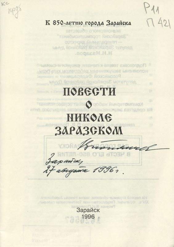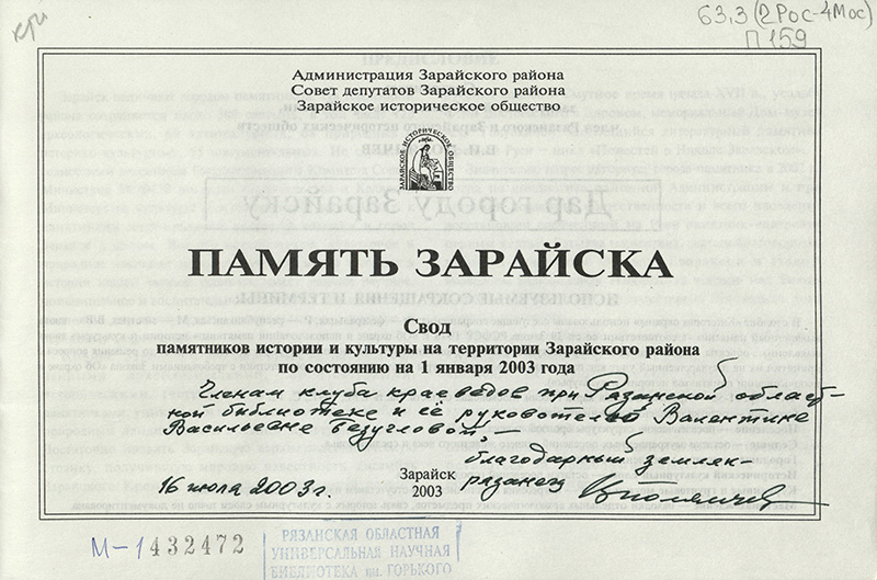 Титульный лист первого тома исторических реалий и легенд «Зарайск» содержит дарственную надпись: «Рязанской областной универсальной библиотеке им. Горького, – В. Полянчев. Зарайск, 2002 г.».