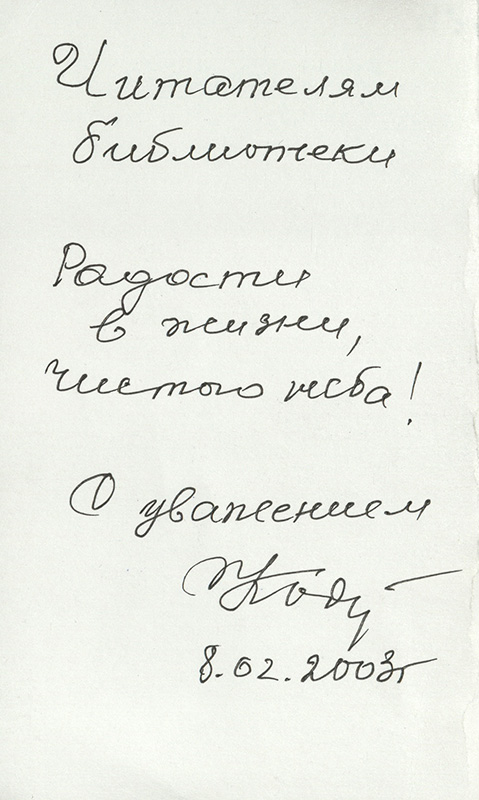 Надпись «В городскую библиотеку г. Рязани от автора» есть на сборнике стихотворений «Горжусь тобой я, Русь Святая!» (2010).