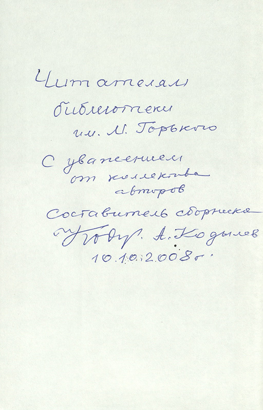В издании «Давайте познакомимся. О жизни и творчестве членов Союза литераторов России (Рязанское отделение)» (2008) есть инскрипты: «Читателям библиотеки им. Горького. С уважением от коллектива авторов, составитель сборника А. Кодылев. 10.10.2008 г.». Второй экземпляр этой книги адресован «Губернатору Рязанской области Олегу Ивановичу Ковалеву с глубоким уважением от имени авторов, составитель сборника председатель Правления Рязанского отделения союза литераторов России А. Кодылев. 31.03.2009 г.».