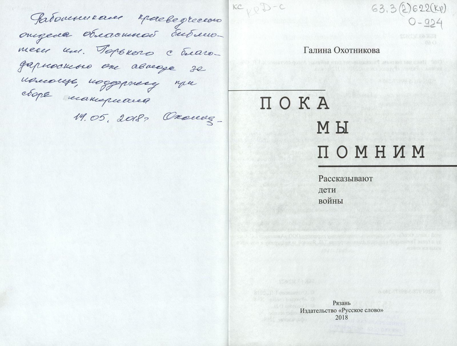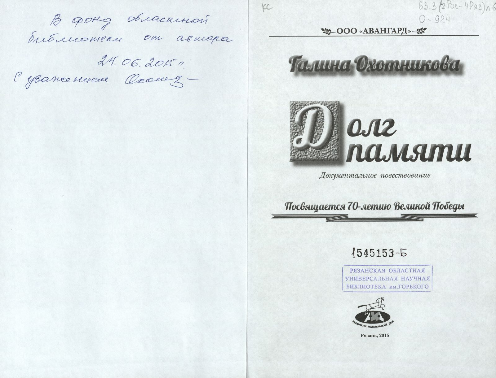 В «Коллекции автографов» областной библиотеки есть несколько книг с дарственными надписями Г.П. Охотниковой, адресованными РОУНБ имени Горького. Эти издания рассказывают о прошлом и настоящем одного из ведущих сельскохозяйственных предприятий Рязанской области, каким является ООО «Авангард», о боевом и трудовом подвиге жителей сел и деревень Тюшевского сельского поселения, о детях войны – живых свидетелях жесточайших событий, которые пришлось пережить всей стране в годы Великой Отечественной войны.