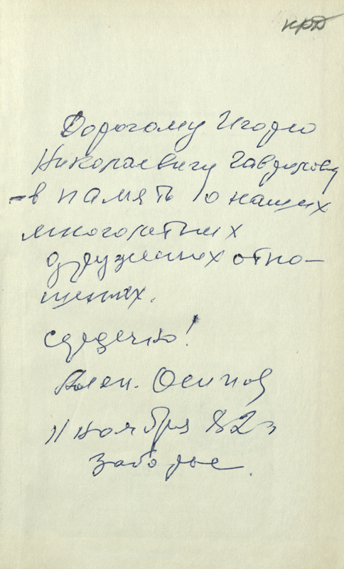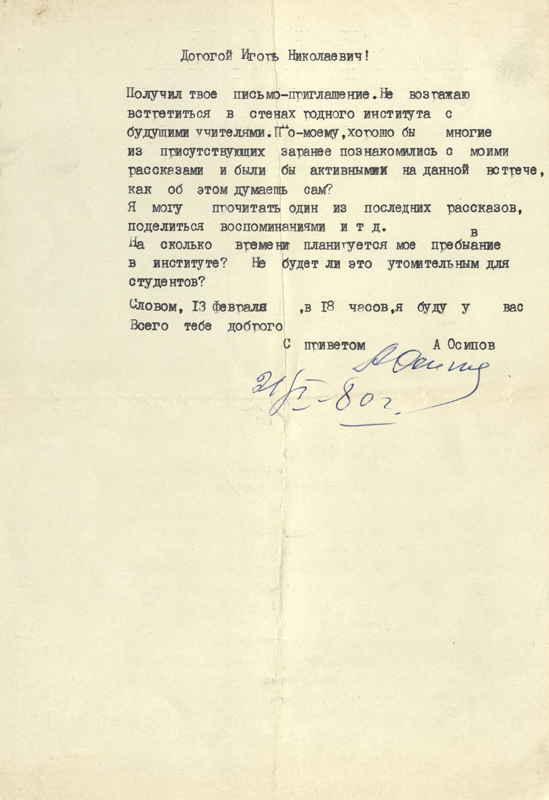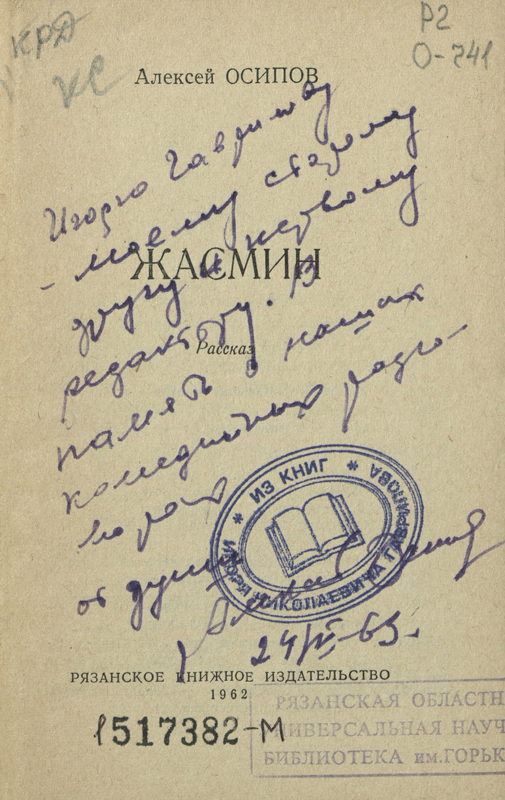 В «Коллекции автографов» и «Архиве И. Н. Гаврилова» Рязанской библиотеки имени Горького хранятся четыре книги А. И. Осипова с автографами автора и его письмо, адресованное известному рязанскому ученому – литературоведу Игорю Николаевичу Гаврилову (1926 – 2003). Дарственные надписи на книгах адресованы И. Н. Гаврилову и Владимиру Николаевичу Шестопалову (1924–1998) – библиофилу, партийному и общественному деятелю Рязанской области.