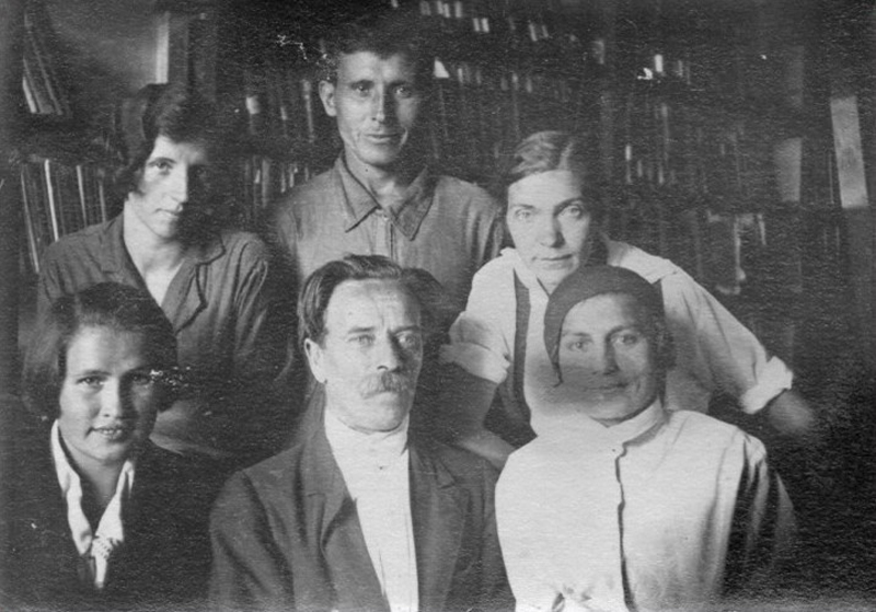Фото 1. Слева направо сидят: Хохолева А.М., лаборант методкабинета; Королев Григорий Тихонович, директор районной библиотеки до 1938 г., заведующий методкабинетом Рязанской областной библиотеки имени Горького (1938–1941); Петрова-Феоктистова Н.С., библиотекарь абонемента.