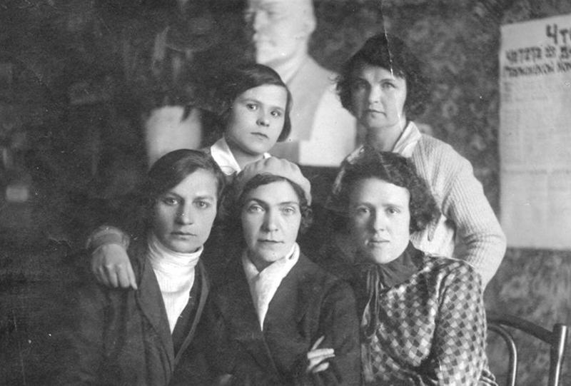 Стоят: Хохолева А.М., лаборант методкабинета; Тянутова Н.И., директор библиотеки (до августа 1941).