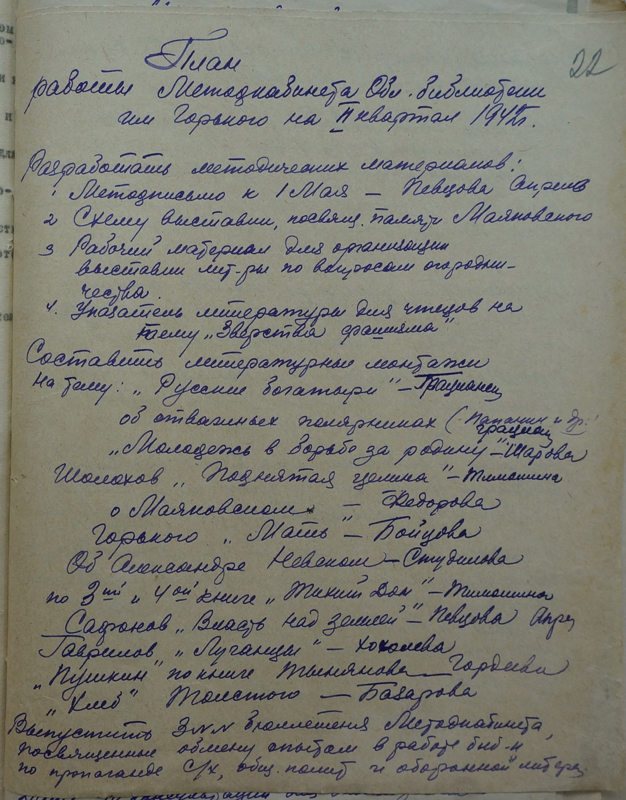 Осенью-зимой 1941 года Рязанская область подверглась нападению немецко-фашистской разведки. Собранные методистами материалы «О состоянии работы политпросвет учреждений…» частично сохранились в архиве РОУНБ имени Горького. В «Делах» подшиты печатные и рукописные документы периода Великой Отечественной войны – так мы узнаем о людях и событиях из истории библиотечного дела.