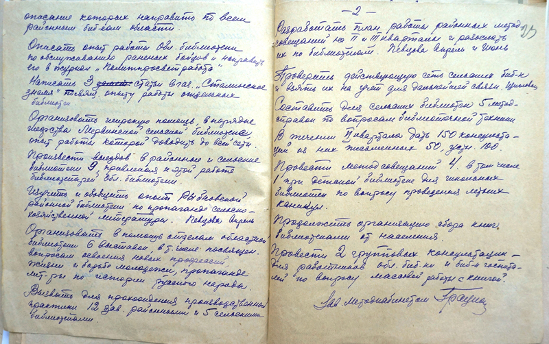 Фото 4–5. План работы методкабинета Рязанской областной библиотеки имени Горького на II квартал 1942 г. Подпись заведующей методкабинетом А.А. Грацианской.