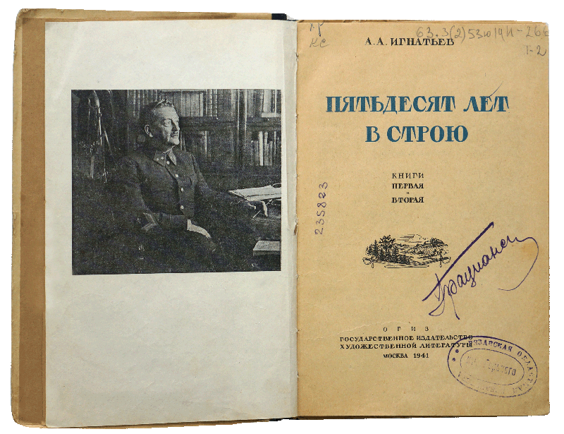 В «Коллекции автографов» «Горьковки» есть владельческая надпись А.А. Грацианской на титульном листе книги генерала-майора А.А. Игнатьева, участника русско-японской войны, после революции перешедшего на советскую службу и опубликовавшего мемуары «Пятьдесят лет в строю» (М., 1941). Книга поступила в фонд библиотеки в августе 1951 года.