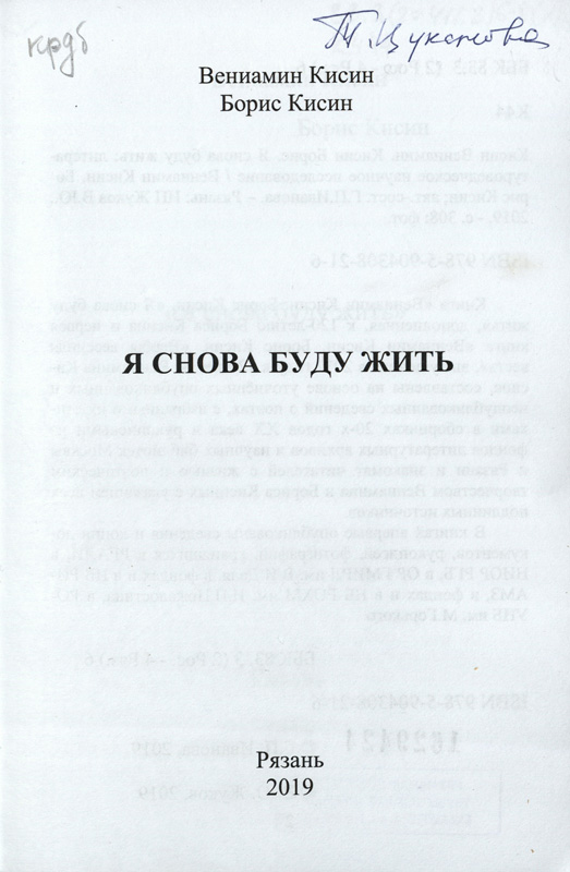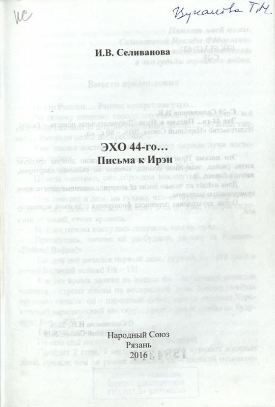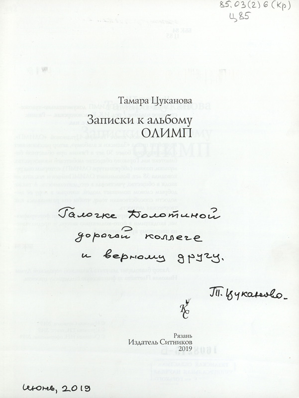 Владельческие надписи есть и на документальной повести И.В. Селивановой «Эхо 44-го… Письма к Ирэн», и на сборнике материалов Международной научно-практической конференции «И.И. Срезневский и история славяно-русской филологии: тенденции в науке, образовании и культуре», подаренном Н.В. Колгушкиной, директором музея академика И.И. Срезневского. Владельческая надпись Т.Н. Цукановой и автограф автора-составителя Г.П. Ивановой есть на редком издании литературоведческого научного исследования «“Я снова буду жить”: Вениамин Кисин, Борис Кисин». Дарственная надпись «Галочке Долотиной – дорогой коллеге и верному другу. Т. Цуканова, июнь 2019» на документально-художественном издании Т.Н. Цукановой «Записки к альбому. ОЛИМП» (2019) адресована Г.А. Долотиной, заведующей научно-методическим отделом, ветерану областной библиотеки, передавшей этот экземпляр в фонд «Горьковки».