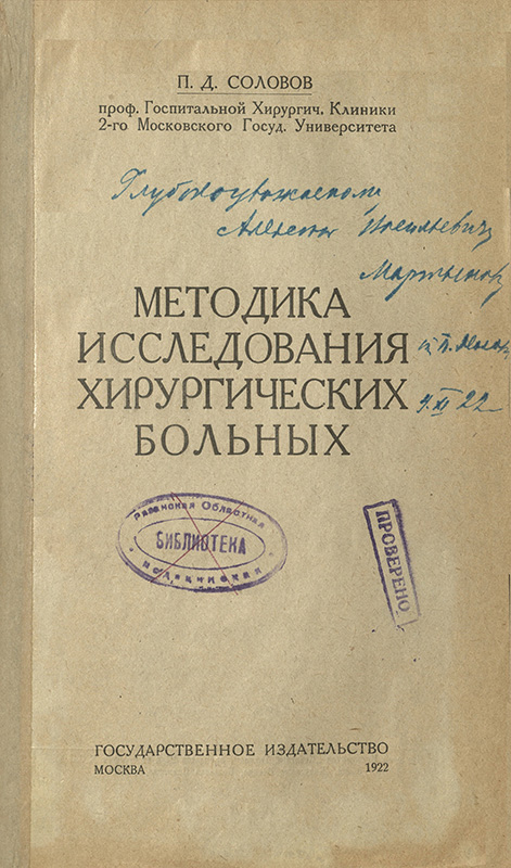 В «Коллекции автографов» нашей библиотеки хранится книга П.Д. Соловова «Методика исследования хирургических больных» (1922), изданная в годы Гражданской войны, с дарственной надписью, адресованной «Глубокоуважаемому Алексею Васильевичу Мартынову 4.11.1922».