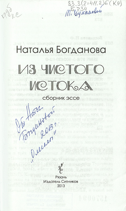 Сборник эссе «Из чистого истока» был адресован Тамаре Николаевне Цукановой (1932–2023), организатору нотно-музыкального отдела нашей библиотеки, создателю и руководителю клуба «ОЛИМП», музыкальному краеведу и просветителю, заслуженному работнику культуры Российской Федерации. Тамара Николаевна подарила библиотеке часть своей книжной коллекции. Надпись в книге гласит: «Т. Цукановой от Наты Богдановой 2013 “ОЛИМП”».