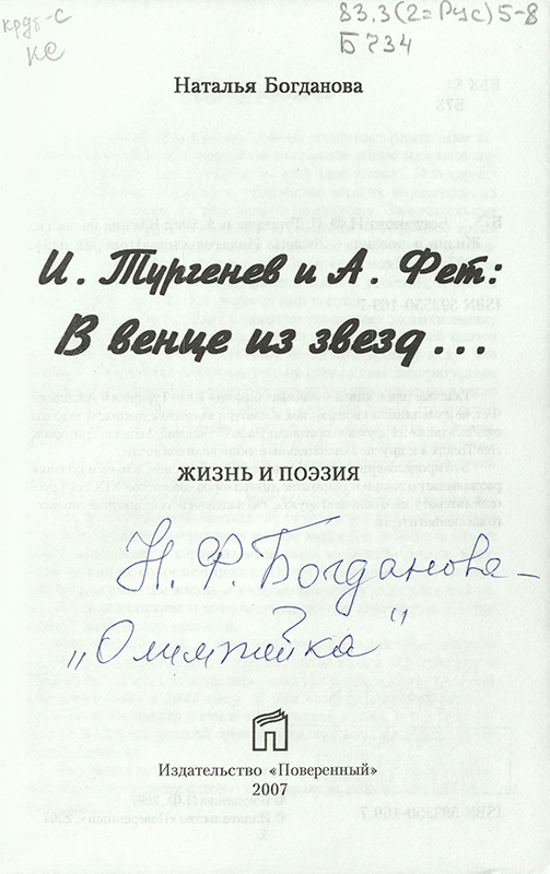 Титульный лист издания «И. Тургенев и А. Фет: В венце из звезд... : жизнь и поэзия» подписан: «Н.Ф. Богданова “Олимпийка”».