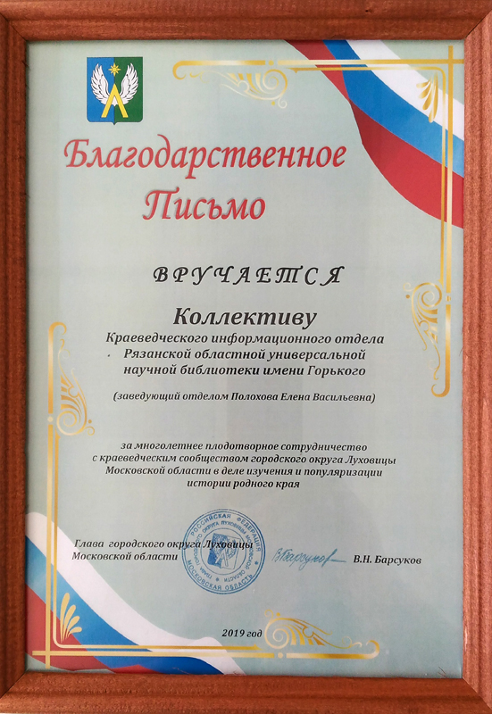 Открывая конференцию, глава городского округа Луховицы Московской области Владимир Николаевич Барсуков сказал слова благодарности в адрес Рязанской областной библиотеки и вручил благодарственное письмо краеведческому информационному отделу.