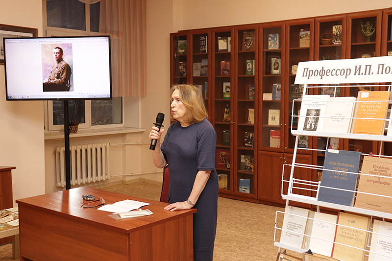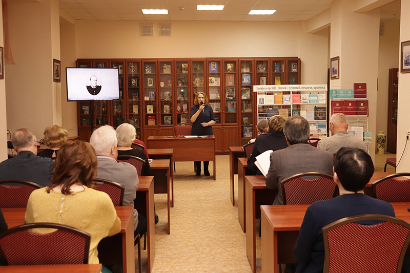 В завершение встречи главный библиограф краеведческого информационного отдела библиотеки Татьяна Юрьевна Ткачева сделала обзор трудов Ивана Павловича Попова, представленных на выставке.