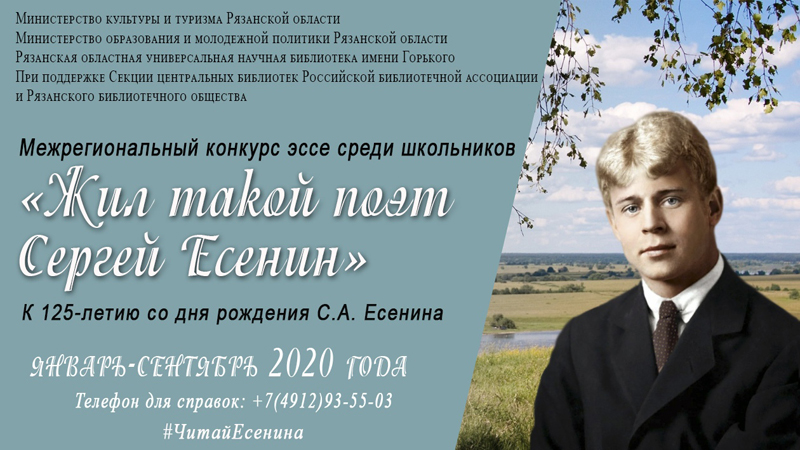 Наша библиотека объявила Межрегиональный конкурс эссе для школьников «Жил такой поэт Сергей Есенин», посвященный 125-летию со дня его рождения. К участию в конкурсе приглашаются учащиеся образовательных учреждений в возрасте от 11 до 18 лет.