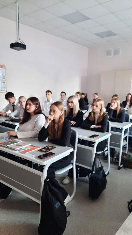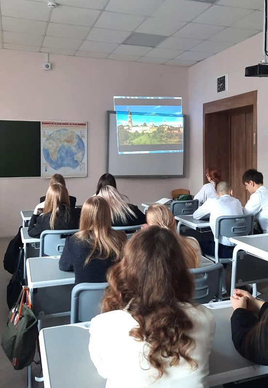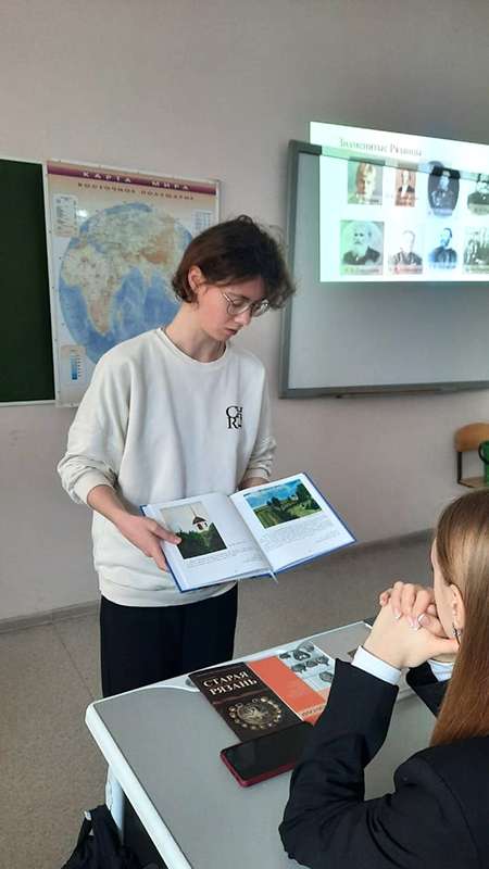 На классном часе «Разговоры о важном» сотрудница библиотеки провела беседу «Моя малая родина – Рязань» для учеников одиннадцатого класса школы № 8, носящей имя Героя России Романа Владимировича Соколова.