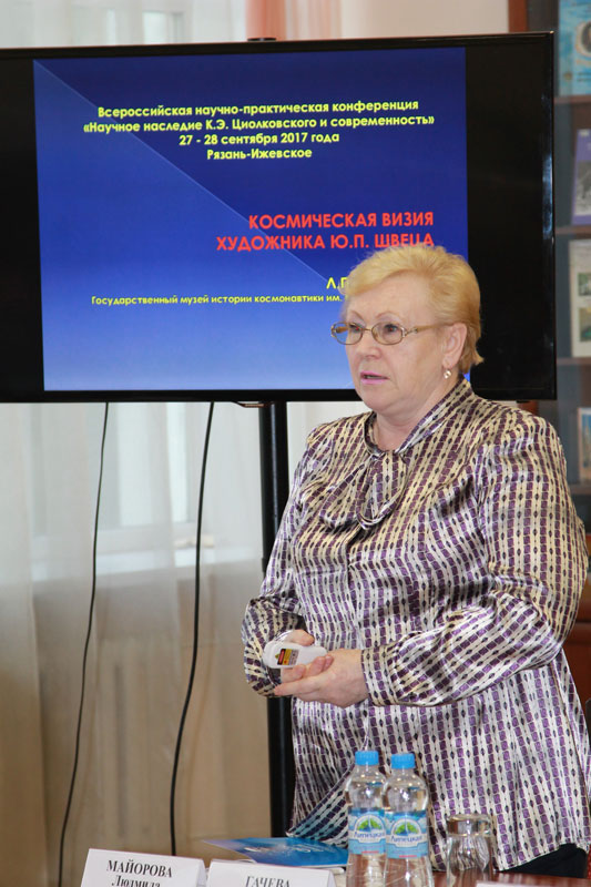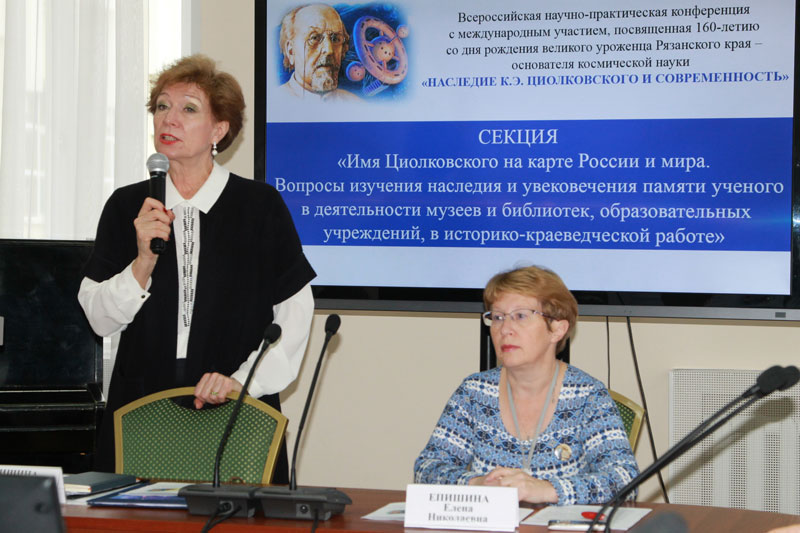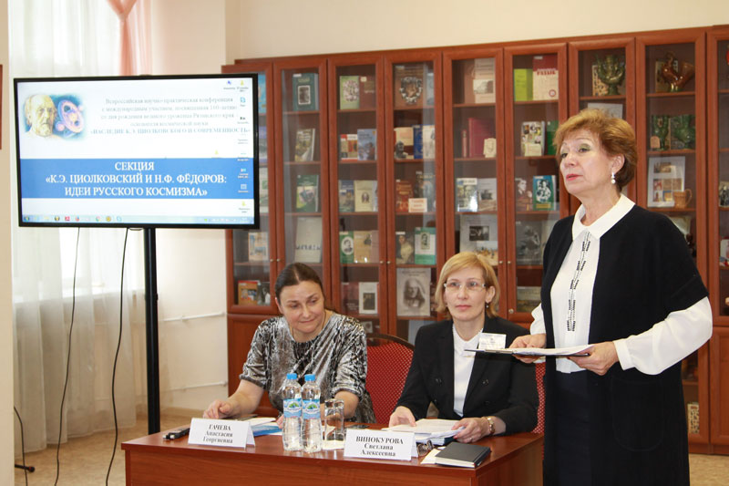 В Центре краеведения работала секция «К.Э. Циолковский и Н.Ф. Федоров: идеи русского космизма». Содержательные доклады представили наши гости: Анастасия Георгиевна Гачева, доктор филологических наук, внештатный сотрудник ИМЛИ РАН; Людмила Павловна Майорова, заведующая отделом научной биографии Мемориального дома-музея К.Э. Циолковского в г. Калуге; Борис Георгиевич Режабек, кандидат биологических наук, руководитель общественного Института ноосферных разработок и исследований. О постулатах космической философии Циолковского рассказала в своем видеодокладе Вера Ильинична Алексеева, кандидат философских наук, сотрудник Государственного музея истории космонавтики имени К.Э. Циолковского (г. Калуга).