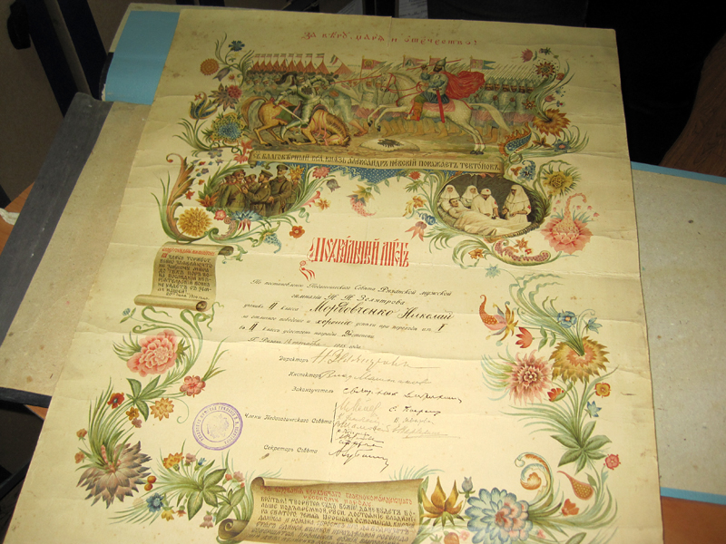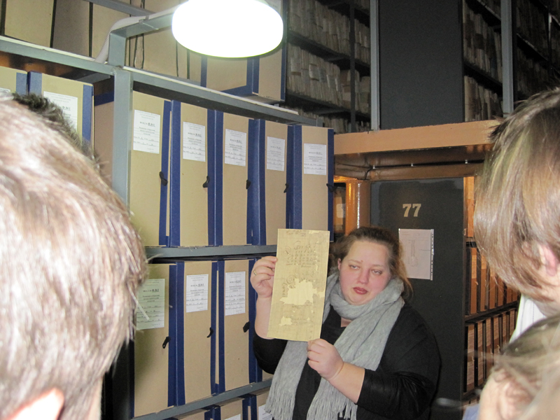 Затем ребята побывали в архивохранилище, где собрано документальное наследие Рязанского края с XVII века по настоящее время и единичные документы XV-XVI веков. Особенно всех присутствующих заинтересовали столбец XVII века – документ, написанный на склеенных в виде ленты бумажных полосах и хранящийся в свернутом виде, а также похвальный лист ученика Рязанской мужской гимназии Н.Н. Зелятрова.