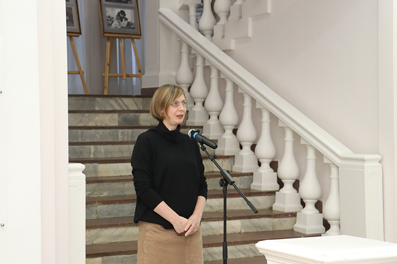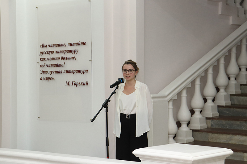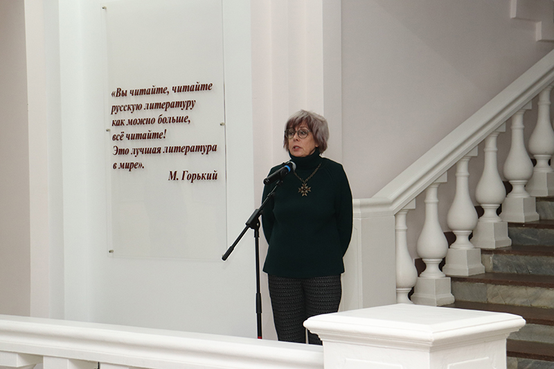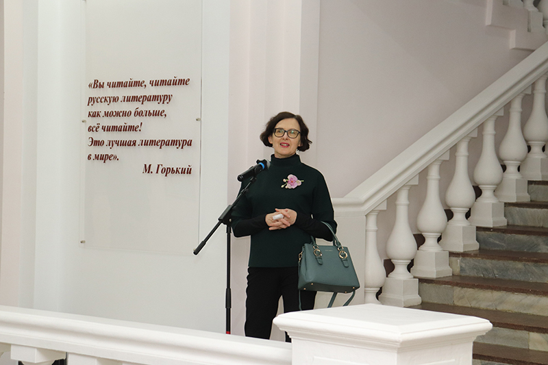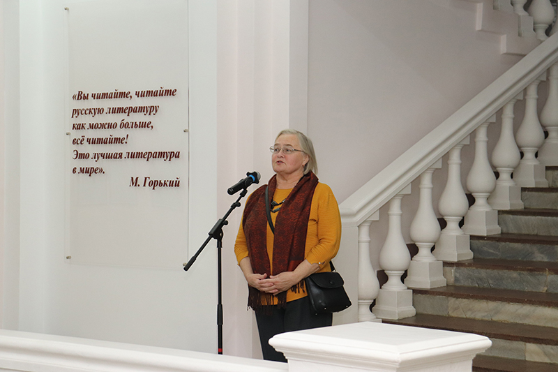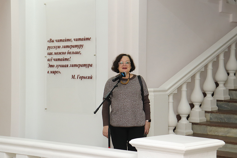 Заместитель директора библиотеки по связям с общественностью Ксения Александровна Чулкова поздравила Александра Петровича Васина с открытием первой персональной выставки в стенах Рязанской областной библиотеки имени Горького и пожелала ему дальнейших творческих успехов.