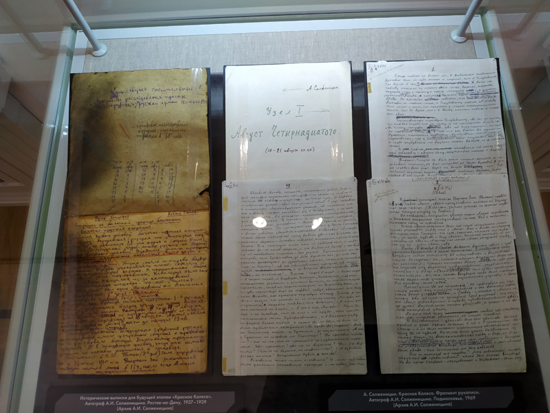 Экспозиция, размещенная на двух этажах, посвящена рязанскому периоду жизни и творчества Александра Исаевича, а также рязанцам, которые знали Солженицына и стали прототипами его произведений. Представлены и подлинные экспонаты – рукописные и печатные тексты, аудиозаписи самого Александра Исаевича.
