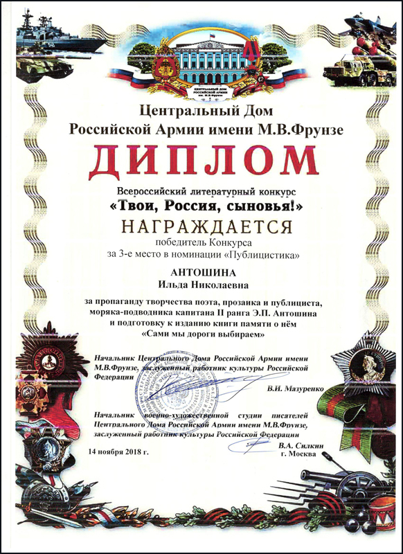 Руководство и сотрудники библиотеки выражают искреннюю радость и поздравляют Ильду Николаевну Антошину, занявшую 3-е место в XII Всероссийском литературном конкурсе «Твои, Россия, сыновья!» в номинации «Публицистика». Столь высокой награды руководитель проекта «Рязанская областная Книга Памяти» удостоена за пропаганду творчества поэта, прозаика и публициста, моряка-подводника, капитана II ранга, мужа Эдуарда Петровича Антошина и подготовку к изданию книги о нем «Сами мы дороги выбираем».