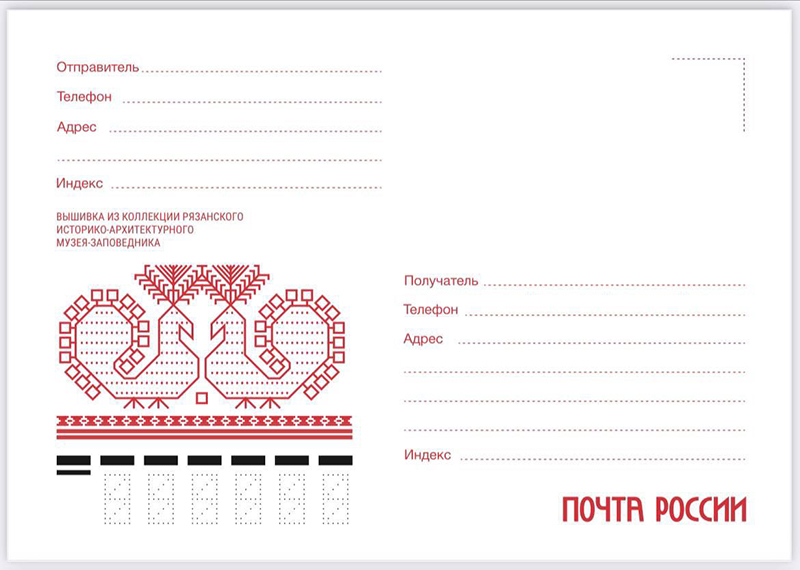 Орнамент традиционной рязанской вышивки использован в дизайне почтовой упаковки – коробок для посылок, пластиковых и бумажных конвертов. В его основе – образцы изделий из коллекции Рязанского историко-архитектурного музея-заповедника.