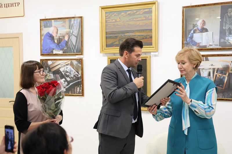 Сергей Алексеевич Кочетков поздравил всех с выпуском каталога, подготовленного «Горьковкой», и вручил директору библиотеки благодарственное письмо от главы администрации Спасского района Н.В. Соломоновой: «Администрация муниципального образования – Спасский муниципальный район выражает Вам, уважаемая Наталья Николаевна, искреннюю признательность и сердечную благодарность за плодотворное сотрудничество и ваш вклад в развитие культуры и искусства Рязанской области! Выставочный проект “В кругу друзей”, посвященный