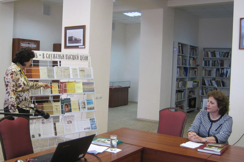 В начале заседания главный библиограф краеведческого информационного отдела А.Д. Сурина провела обзор книжной выставки «Жизнь – в служенье высшей цели», посвященной Надежде, Софье и Прасковье Хвощинским.