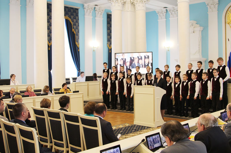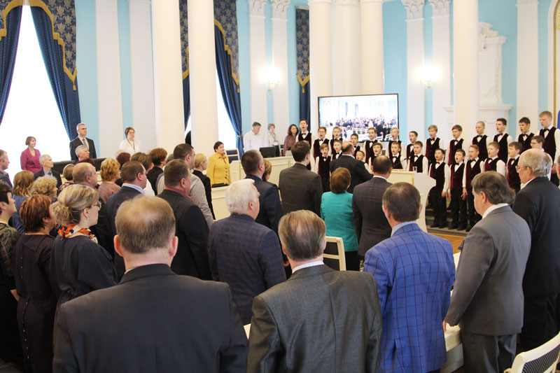 Приветственный блок и выступления докладчиков предварило исполнение Гимна РФ хоровой капеллой мальчиков «Любомир» детской школы № 4 имени Е. Г. Попова г. Рязани.
