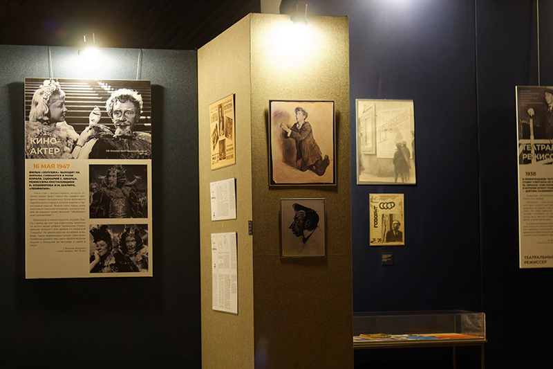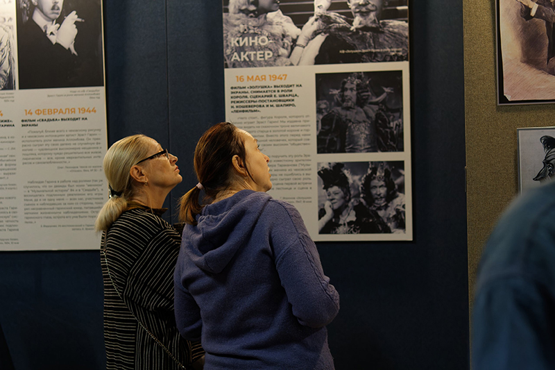 Информационные стенды, фотографии и цитаты современников об Эрасте Гарине и его творчестве; зона библиотеки с любимыми книгами артиста – выставка продумана до мелочей.